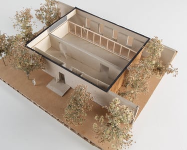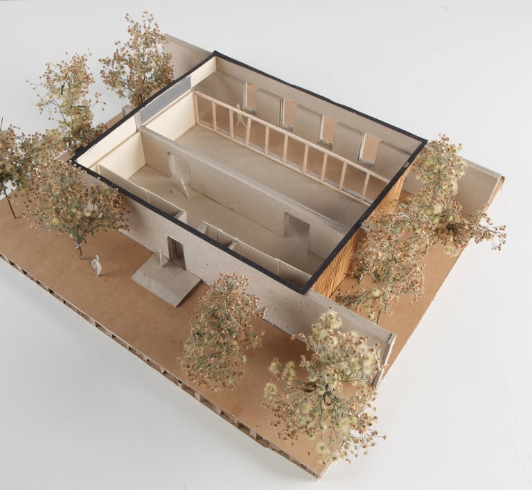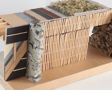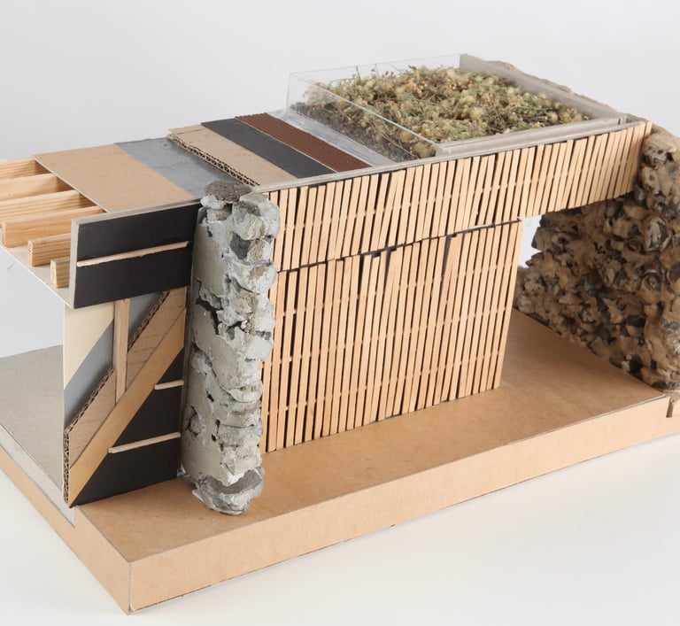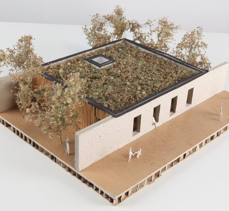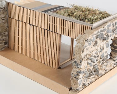 Le pavillon adopte une architecture discrète, s'effaçant entre deux murs en bois et deux murs en pierre, inspiré par la Casa Moledo de Souto de Moura. Son intégration à l'échelle du parc et des logements sociaux se renforce avec une insertion dans une forêt urbaine, complétée par une toiture végétalisée.