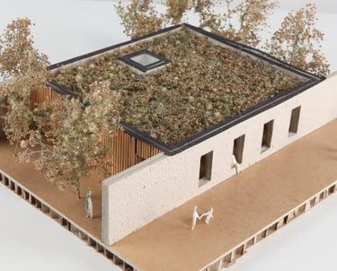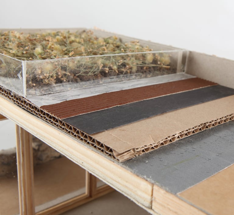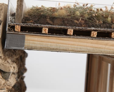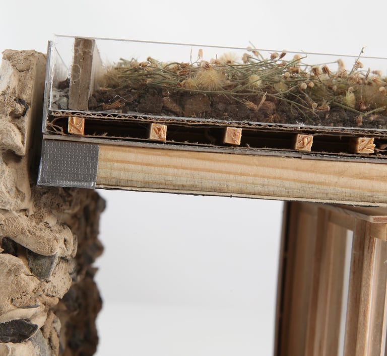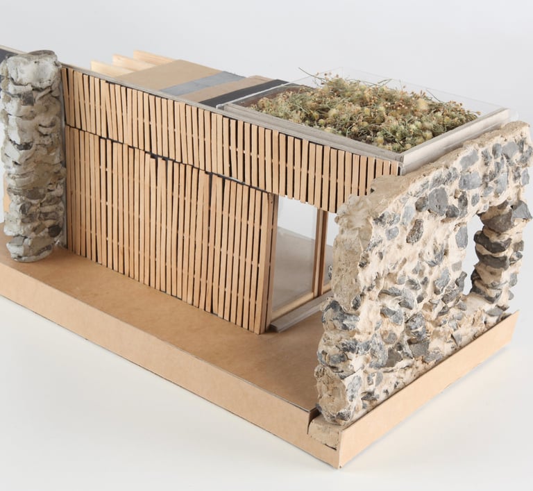 La structure simple du bâtiment repose sur des pannes entre deux murs en pierre et un mur en béton, soutenant une toiture végétalisée. Un U cimenté maintient les poutres espacées de 50 cm, capables de soutenir les 350 kilos par mètre carré du toit végétalisé.