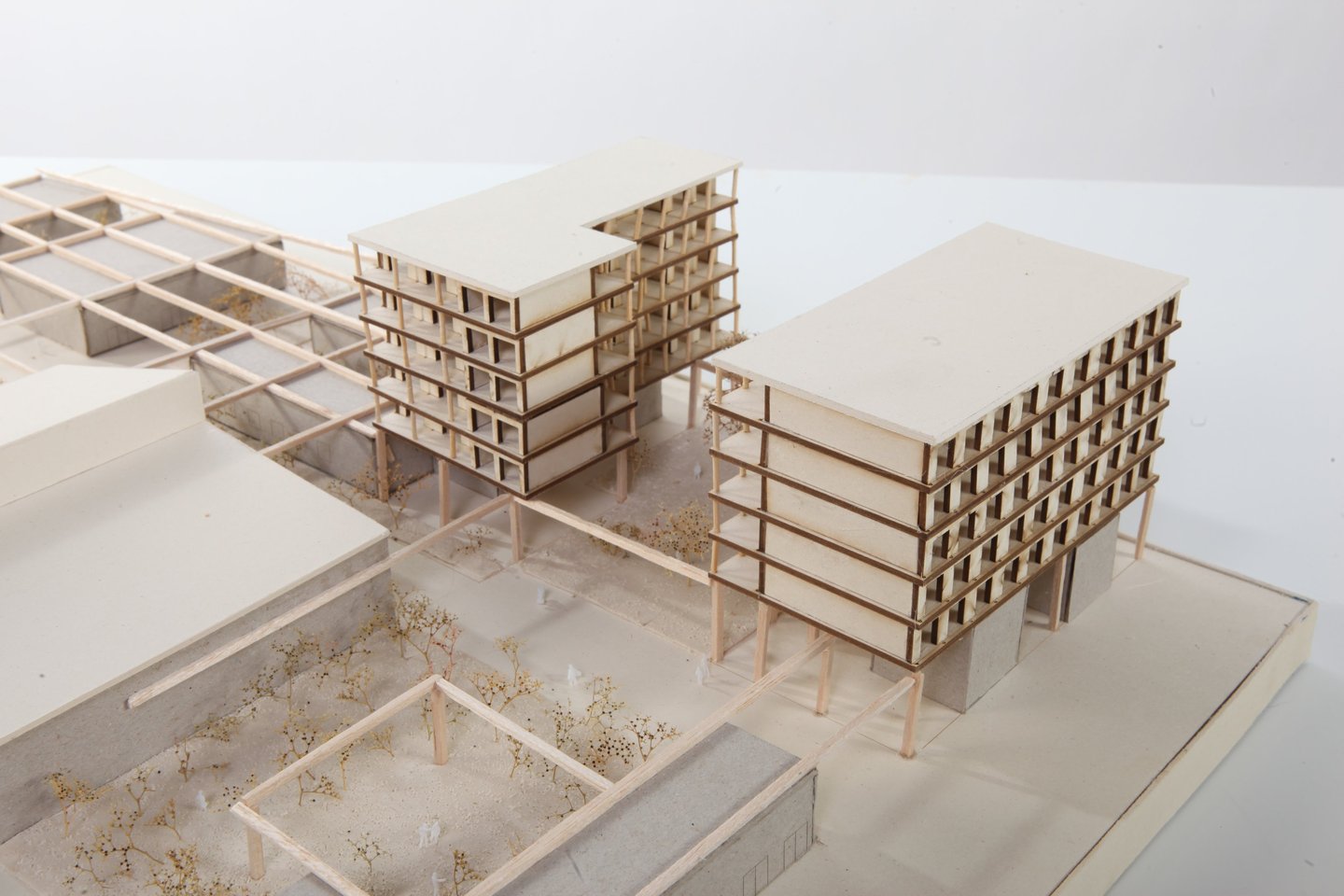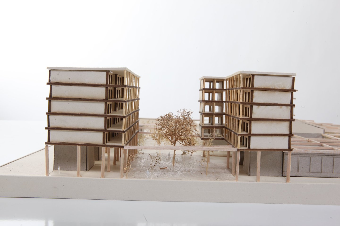 On souhaite trouver le bon équilibre entre vivre ensemble et se sentir chez soi. Ainsi, on vient installer deux noyaux de circulation verticale pour chaque bâtiment, desservant 2 ou 3 logements par niveau, avec des ouvertures sur des paliers extérieurs. Les logements suivront un principe simple : d’un côté, les chambres et la salle de bain, de l’autre, la cuisine et le séjour, favorisant la traversée des pièces de vie de façade à façade. L’architecture se caractérisera par une alternance verticale des baies et des enduits clairs, avec des fenêtres positionnées au centre de leur trame constructive, soulignées par un traitement en bois pour accentuer leur élancement vertical.